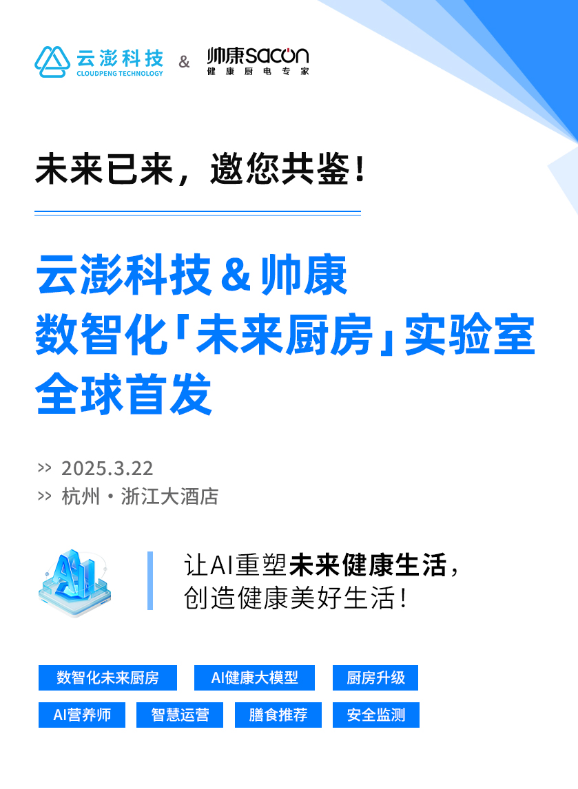 喜訊!云澎科技與帥康自2024年達成深度合作,雙方一直以強強合作·蓄勢共贏為合作準則,共同探索AI技術在廚房場景中的創新應用。經過雙方嚴謹周密的技術研發與場景驗證,云澎科技在此正式宣布,將于3月22日在杭州正式發布“數智化未來廚房實驗室”啟動大會。