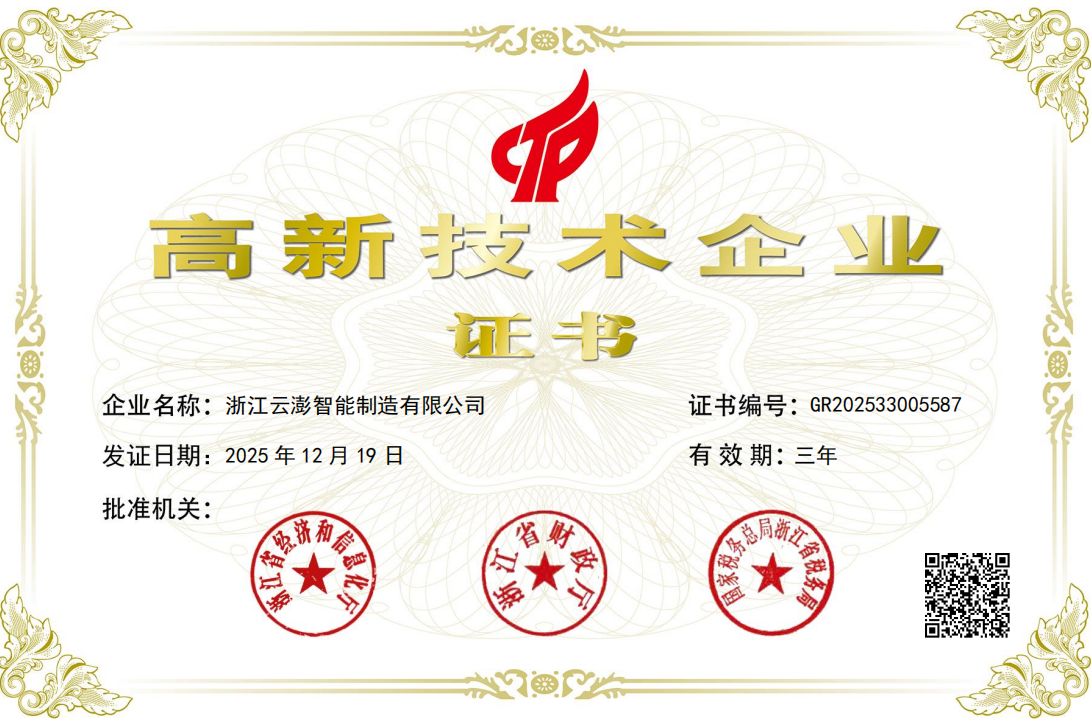 云澎智能制造獲評國家高新技術企業