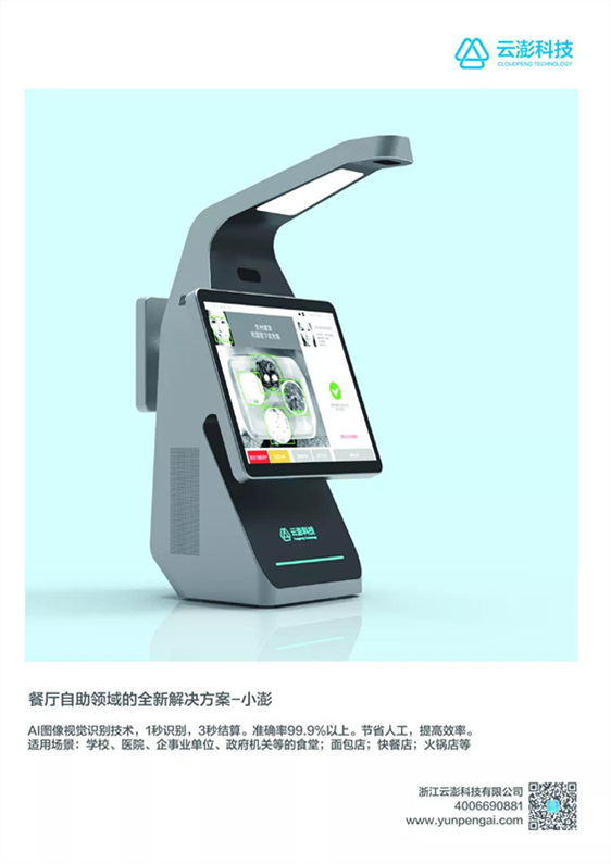 云澎智能結算餐臺,通過AI圖像視覺識別技術,無需使用芯片,能直接識別菜品(包括水果、飲料、面包等),也可識別市面上所有餐盤(包括無法植入芯片的鐵板燒、砂鍋、蒸籠等);支持人臉支付、手機支付、一卡通支付。