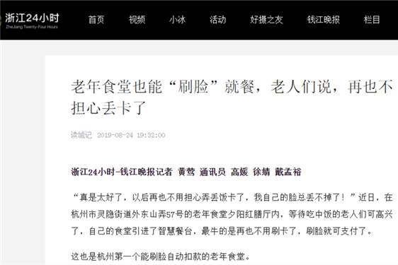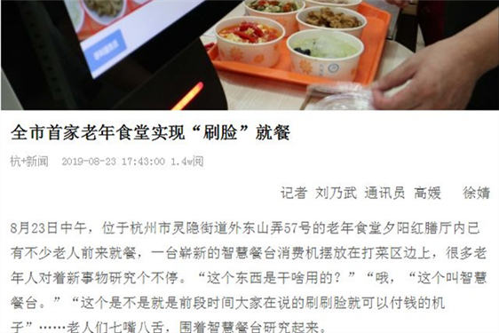 杭州首家老年食堂實現“刷臉”就餐吸引了多家媒體的目光,受到西湖傳媒、錢江晚報等多個媒體相繼報道。